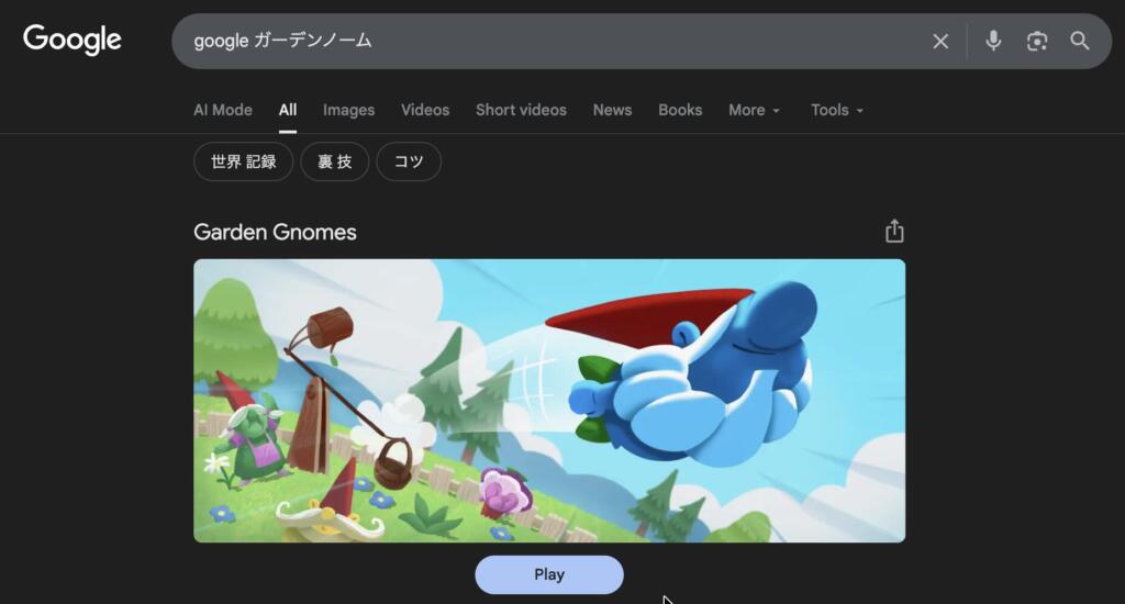 Googleの検索ボックスに「Googleガーデンノーム」、「ガーデンノーム」、「Garden Gnomes」 と検索するとゲームが表示されます。