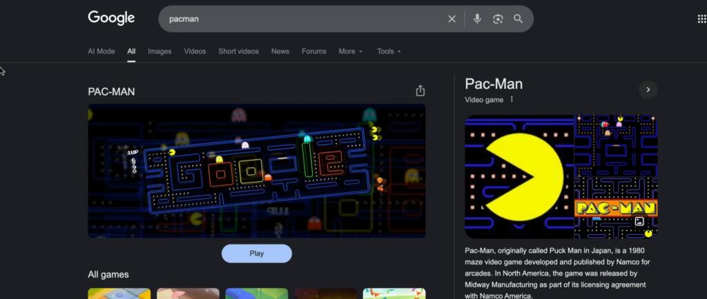 検索結果の一番上に、パックマンのゲーム画面が表示されるので、「プレイ」というボタンを押すと、ゲームが起動します。
