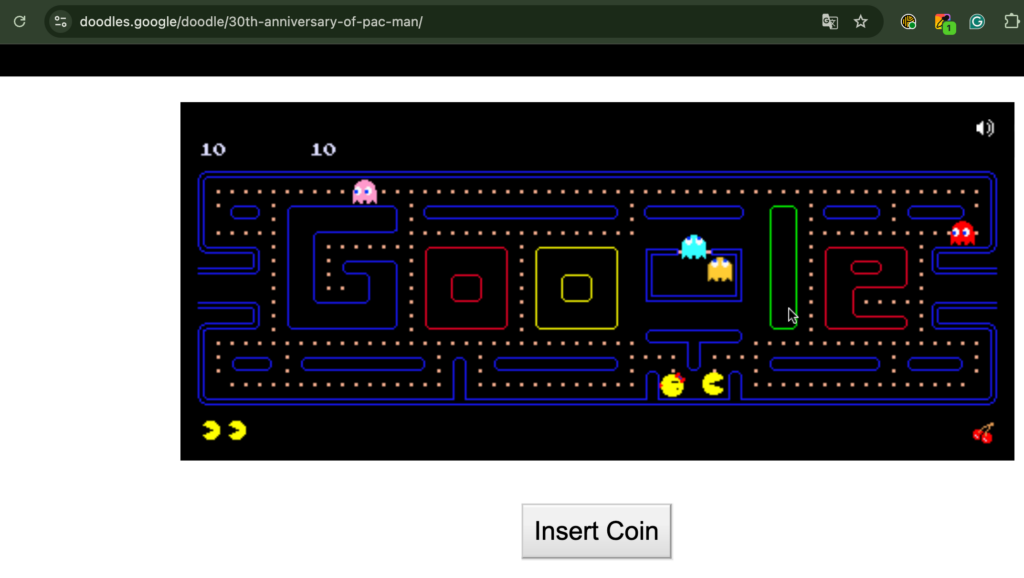 本記事の画像は、Pacman Doodle30th Anniversary of PAC-MAN Doodleのプレイ中の画像をスクショし、挿入しています。